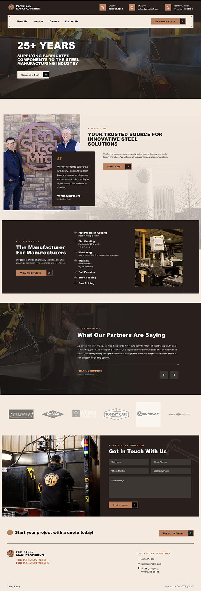 We were fortunate enough to be able to work with Trent and Jacob on designing and building them a new website that better showcases who they are as a company. We started with their ‘penny logo’ and brought in a variety of brown colors—all in different shades. We were able to incorporate some compelling imagery from their factory, giving visitors to the site a flavor for the work they do and the vast array of machinery they have at their disposal.