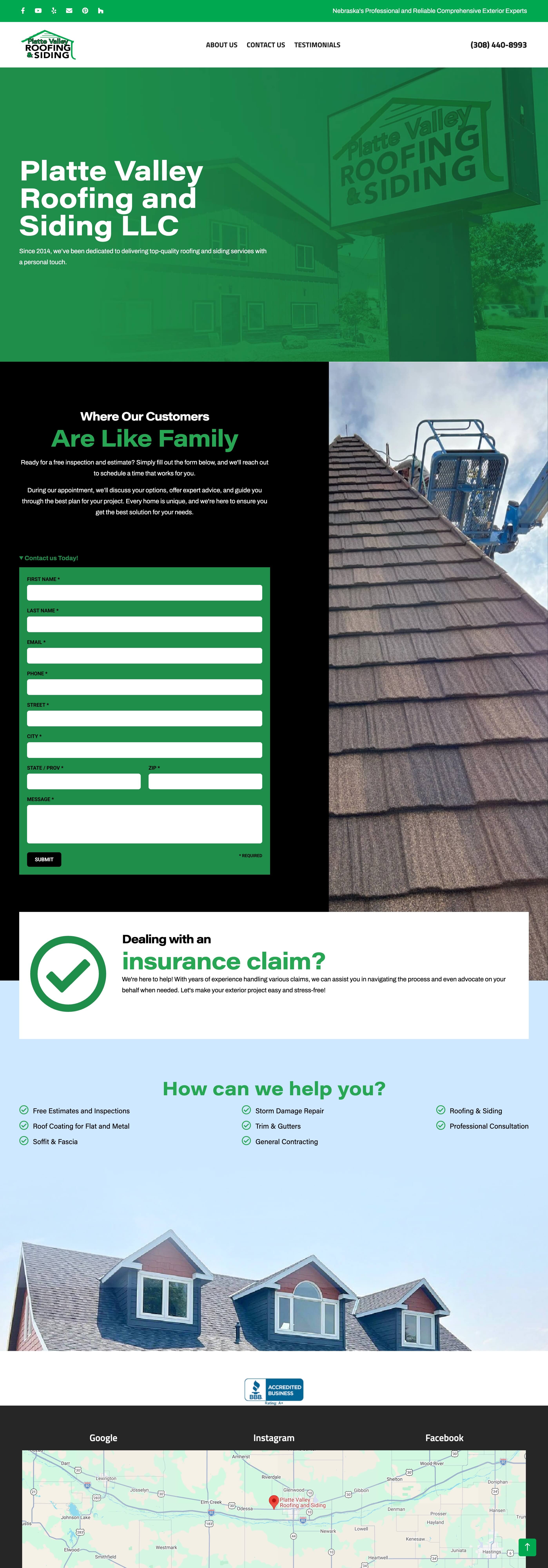 For roofing and siding contractors especially, potential customers need to quickly understand the breadth of services offered, see credentials and trust signals, and have easy access to request estimates. We designed Platte Valley’s website with these essentials front and center—featuring prominent contact information, a streamlined estimate request form, BBB accreditation, clear service listings, and testimonials from satisfied customers. The professional yet approachable design mirrors Will’s hands-on, customer-first philosophy.
