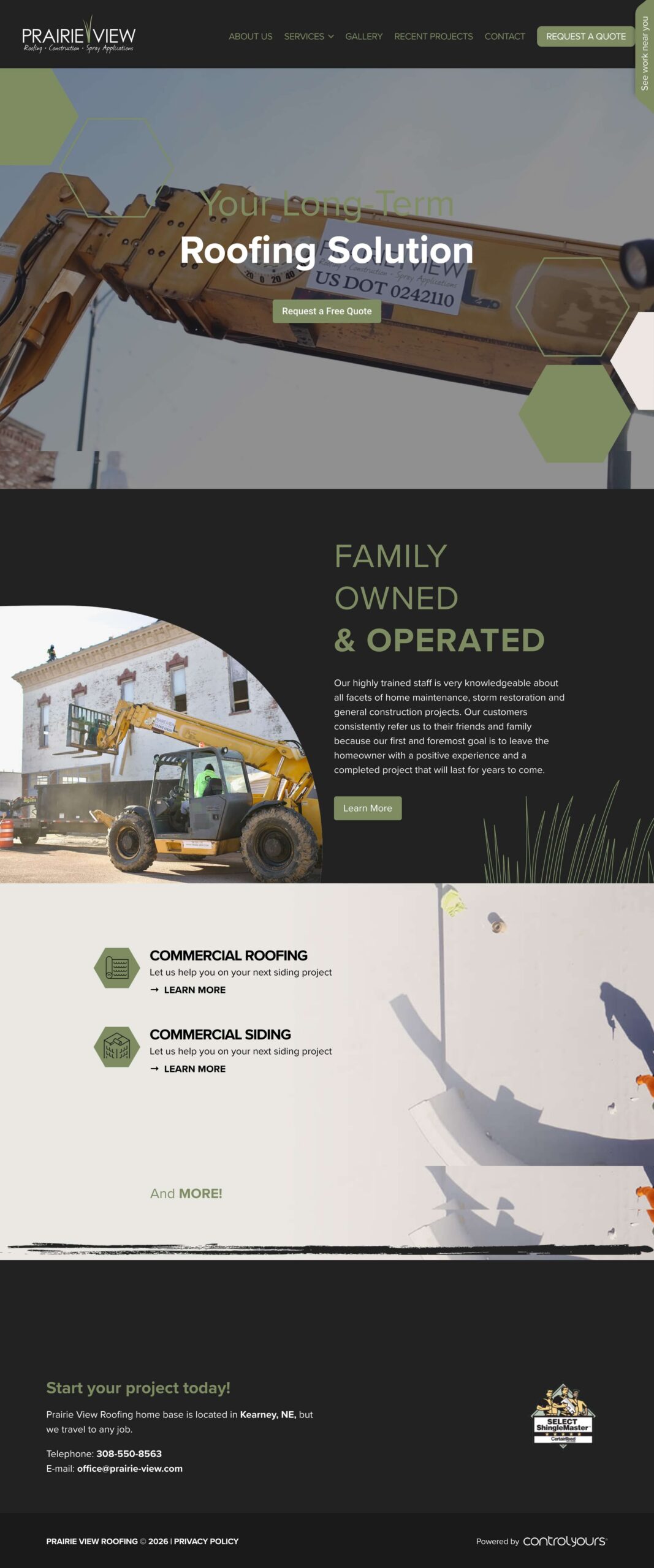 For roofing companies in particular, potential customers need quick access to service information, a portfolio of completed projects, and an easy path to request quotes. We designed Prairie View Roofing’s website with these priorities at the forefront—creating a professional, trustworthy presence with clear service categories, an extensive project gallery, streamlined quote requests, and prominent contact information. The clean design reflects the quality and precision that Prairie View brings to every job site.